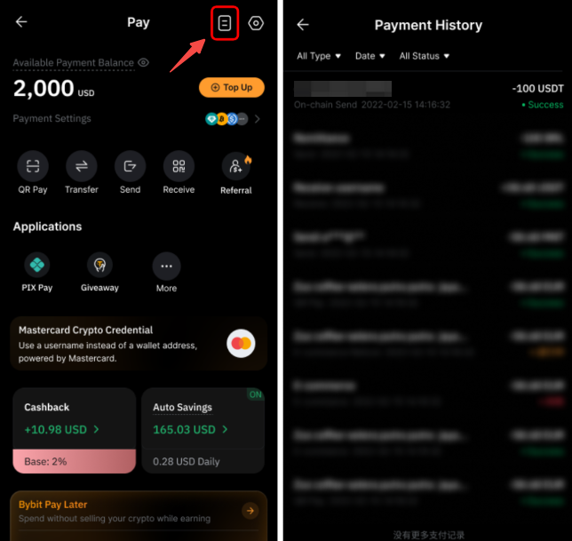 Vá para a página do Bybit Pay e toque no ícone Histórico de Pagamentos localizado no canto superior direito.