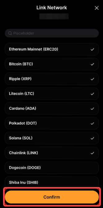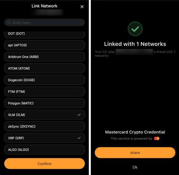 Passo 3: Digite o nome da rede na barra de pesquisa, selecione a rede desejada, e depois toque em Confirmar para vincular com sua Credencial Cripto Mastercard.