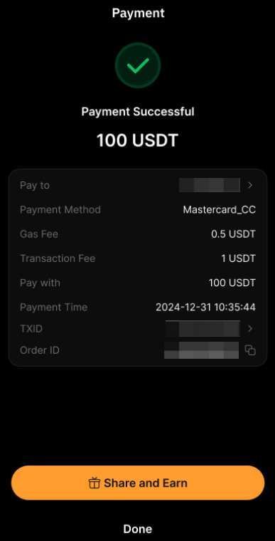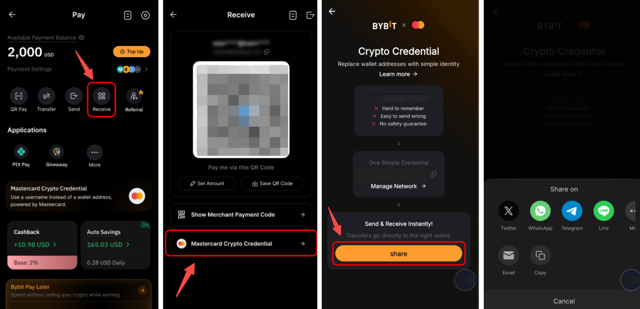 Toque em Receber na página do Bybit Pay, depois toque em Mastercard Crypto Credential. Toque em Compartilhar para compartilhar sua solicitação de recebimento nas suas redes sociais ou enviá-la como um link para o remetente.