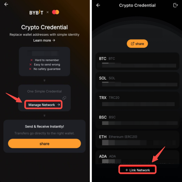Mastercard Crypto Credential é um serviço que substitui endereços de carteira longos e complexos por um alias simples e legível (nome de usuário). Isso ajuda os usuários a enviar e receber criptomoedas de forma mais fácil e segura. Este recurso está atualmente disponível apenas no aplicativo Bybit.