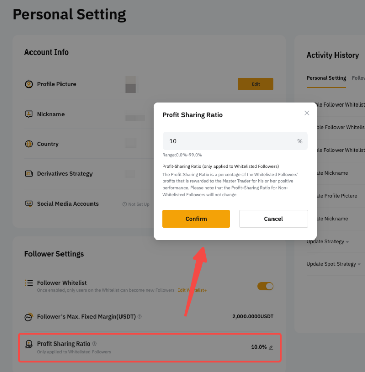 3. Você pode definir uma proporção de compartilhamento de lucro entre 0% e 50%. Qualquer alteração se aplicará a todos os Seguidores.