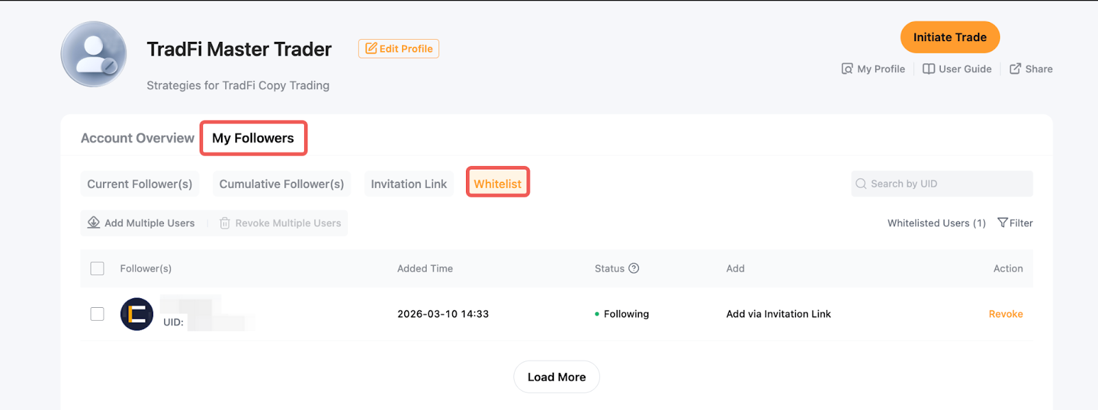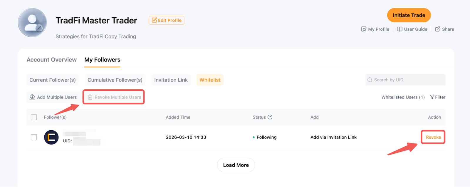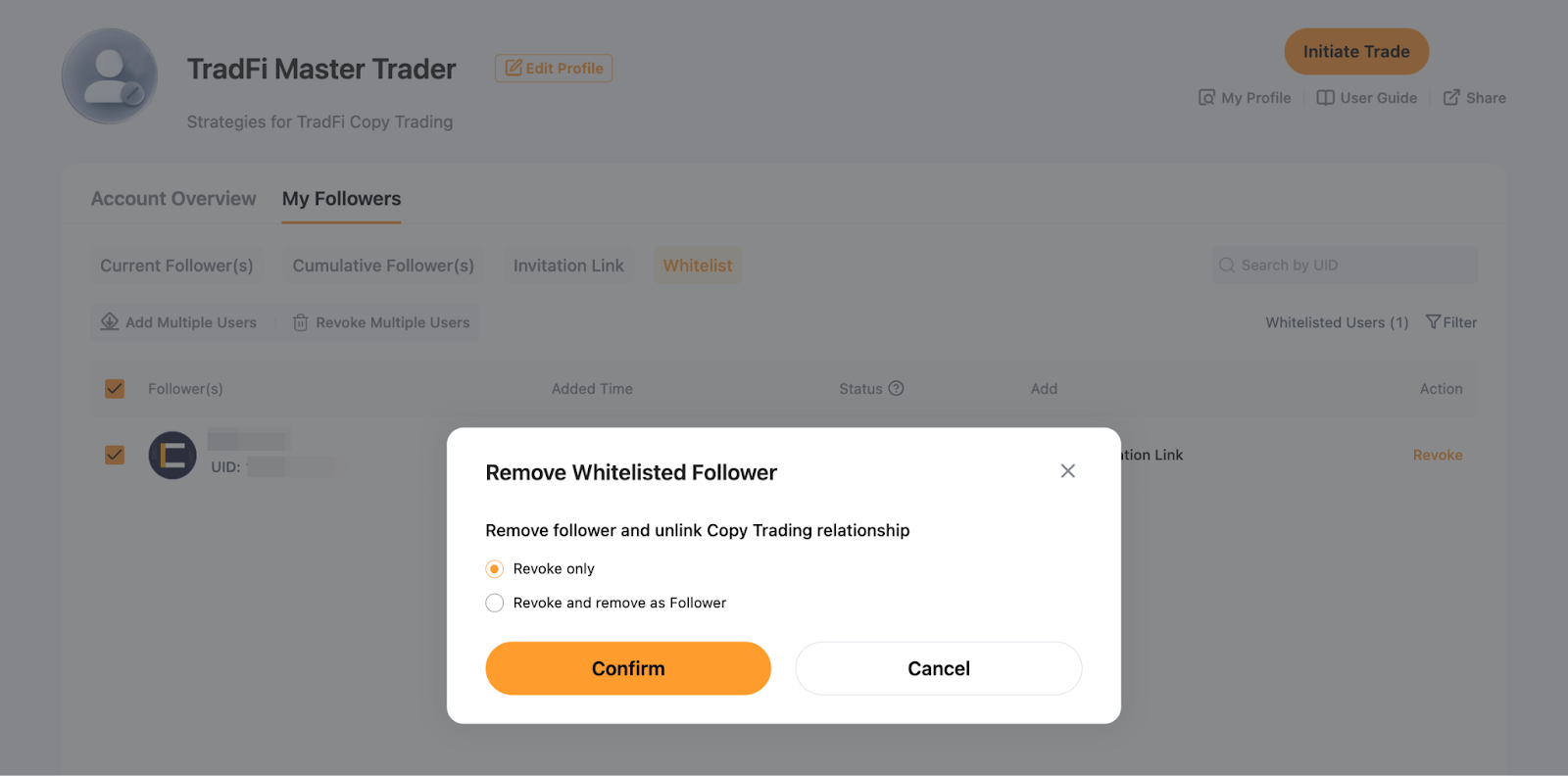 Passo 1: Para remover um Seguidor da sua lista branca, vá para Central de Usuário (Comerciante Mestre) e clique em Meus Seguidores → Lista Branca → Revogar.