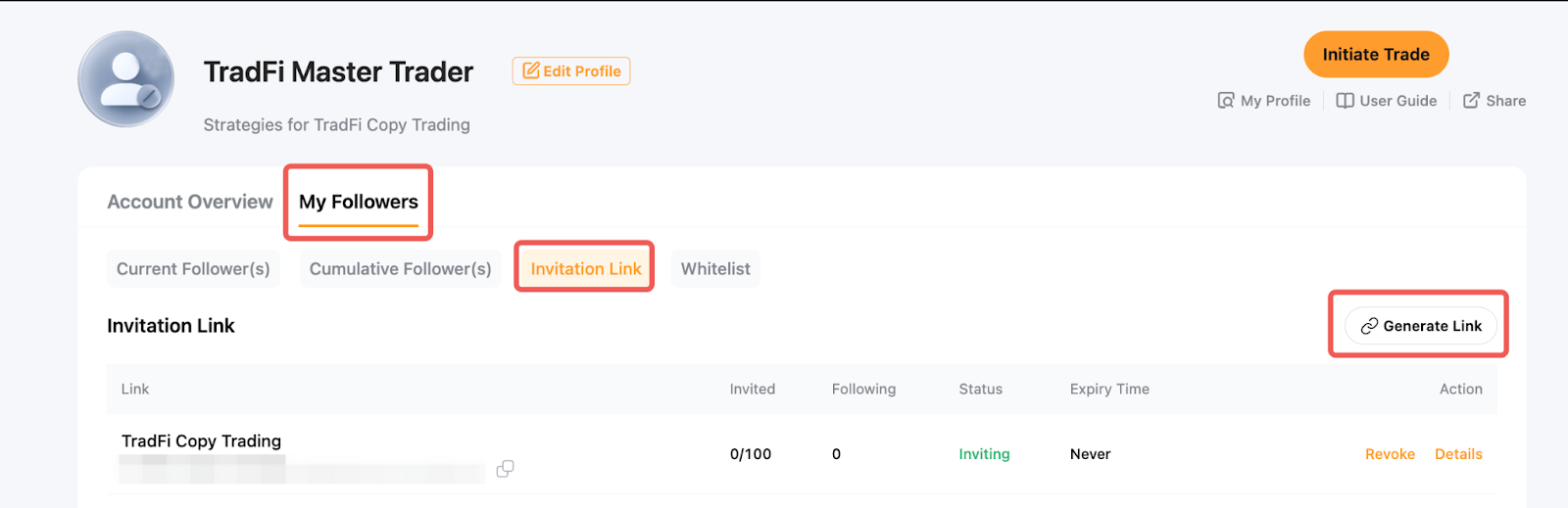 Passo 1: Para criar um link de convite, vá para Central do Usuário (Trader Mestre) → Meus Seguidores → Convites, depois clique em Gerar Link.