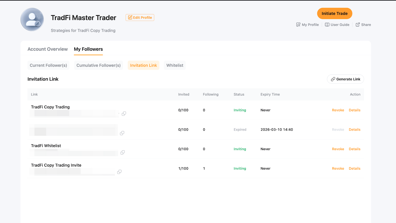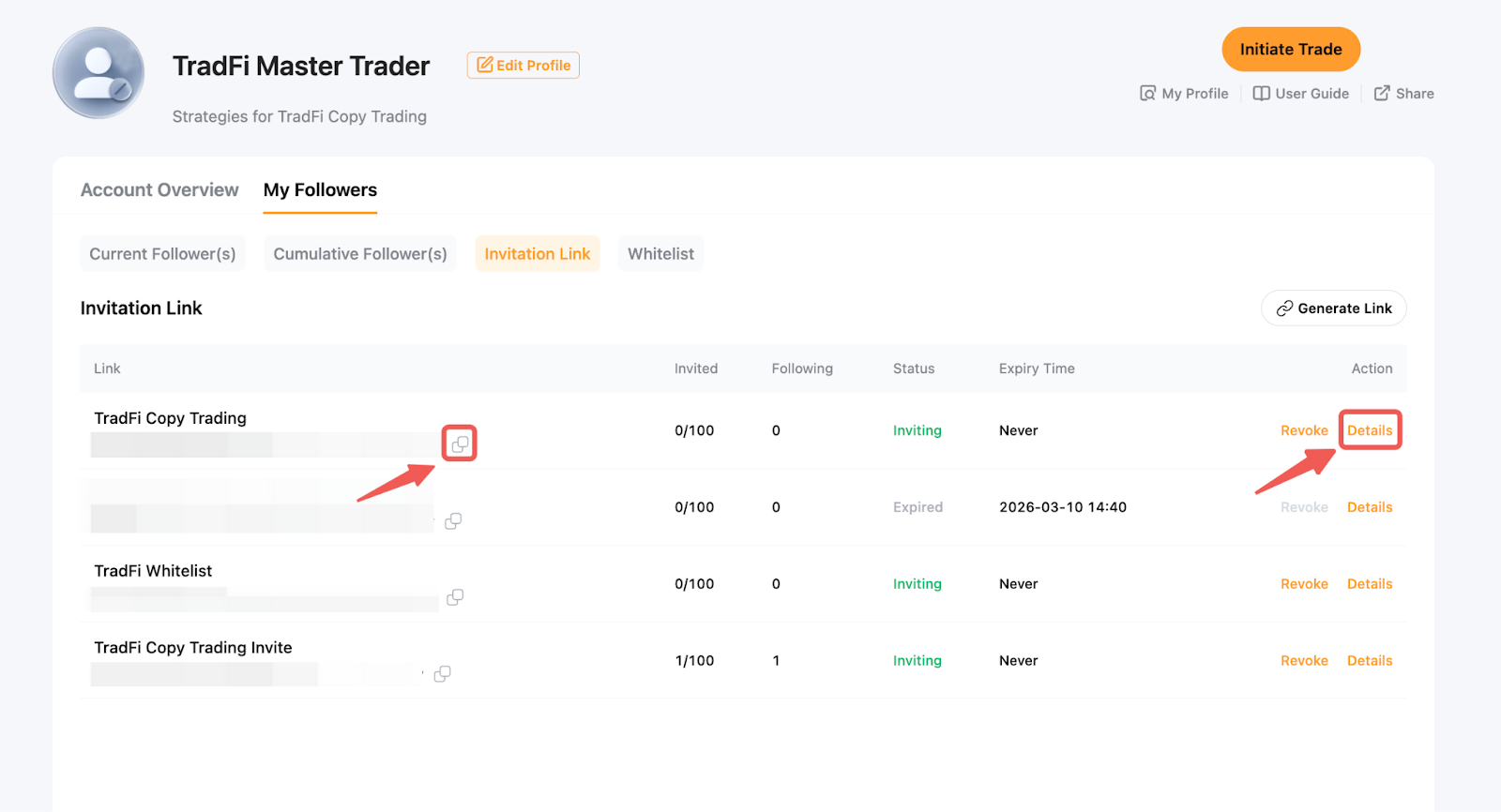 Como um Trader Mestre, você pode gerar um link de convite único que permite que Seguidores copiem suas negociações diretamente sem confirmação adicional. Se a Lista de Permissão de Seguidores estiver ativada, Seguidores que ingressarem através do link de convite serão automaticamente adicionados à lista de permissões.