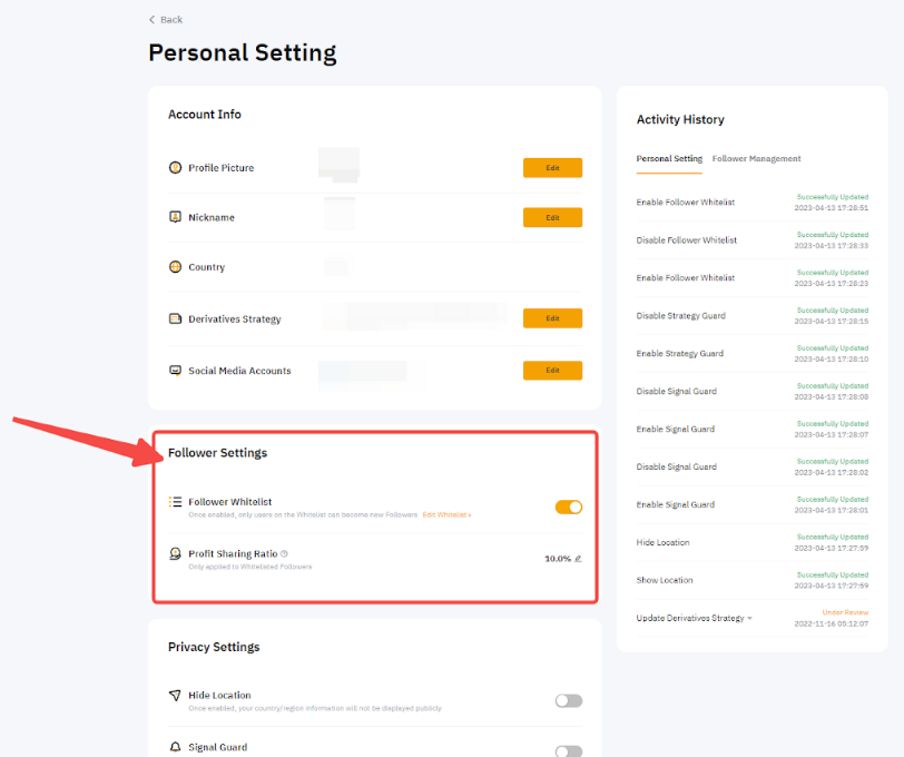 Para habilitar sua Lista Branca de Seguidores, vá para Centro do Usuário (Trader Mestre) → Configurações Pessoais → Configurações de Seguidores, e ative a opção de Lista Branca de Seguidores .