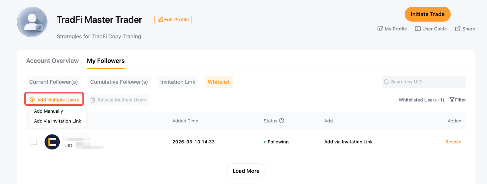 Copy Trading TradFi oferece duas funcionalidades — Link de Convite e Lista de Seguidores Autorizados — que permitem que os Traders Mestres gestionem quem pode seguir suas operações.