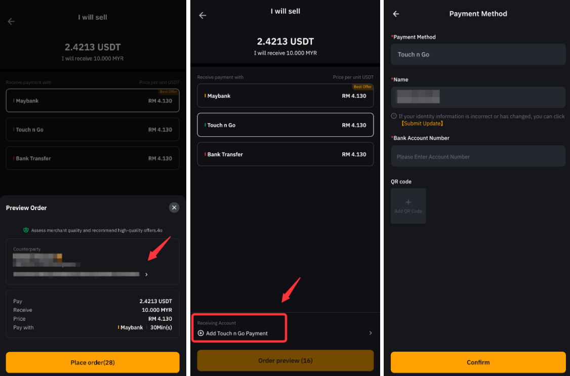 3o passo: Selecione a forma de pagamento que deseja usar para receber a moeda fiat e você será direcionado para a página de visualização da ordem.
