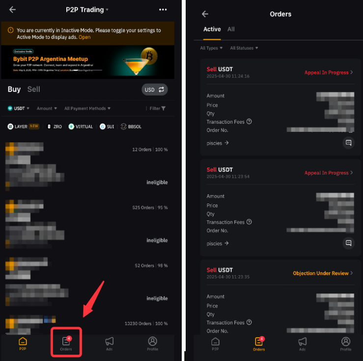 Você pode visualizar o histórico de ordens acessando Ordens na página Trading P2P.