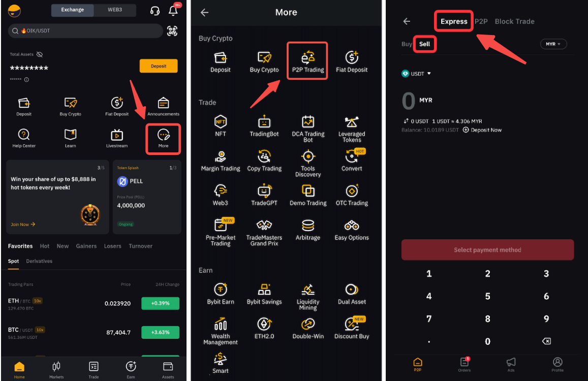 1o passo: Na página inicial, clique em Mais → P2P e, na parte superior da página de trading P2P, selecione a guia Expresso P2P.