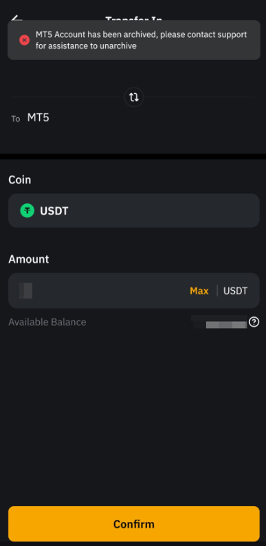 3. Você verá uma mensagem de erro ao tentar transferir fundos para dentro e para fora da sua conta MT5.