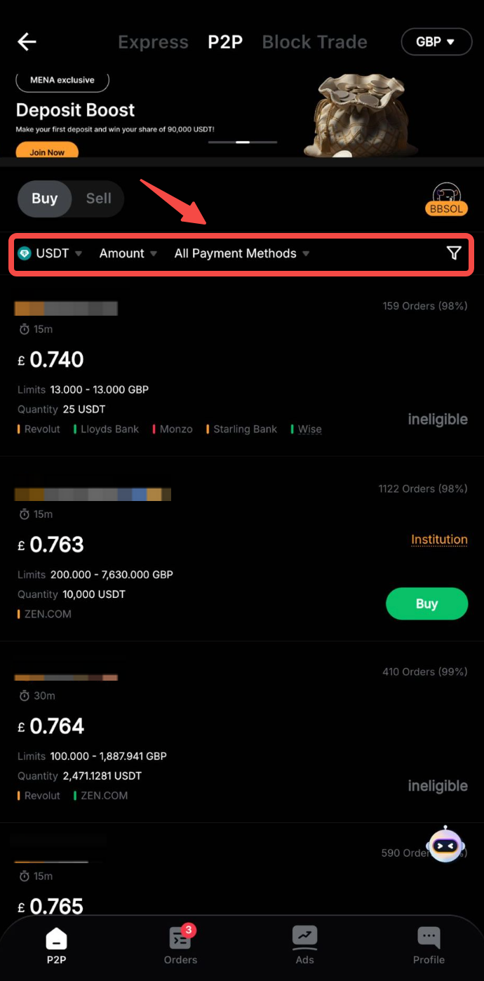 Etapa 2: Na página Comprar, você pode filtrar os anunciantes selecionando os critérios desejados para Moedas Fiat ou Método de Pagamento — Saldo Fiat, com base nos requisitos da transação.