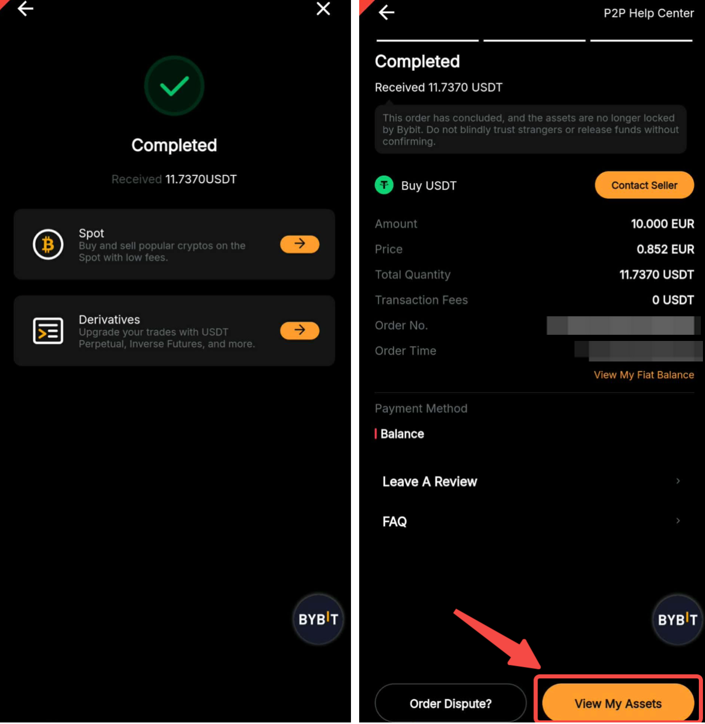 Etapa 7: Depois que o vendedor tiver liberado com sucesso as moedas compradas, você pode clicar em Visualizar meus ativos para visualizá-los junto com seu histórico de transações. Você também pode verificar o status do seu ordem no histórico de ordens P2P.