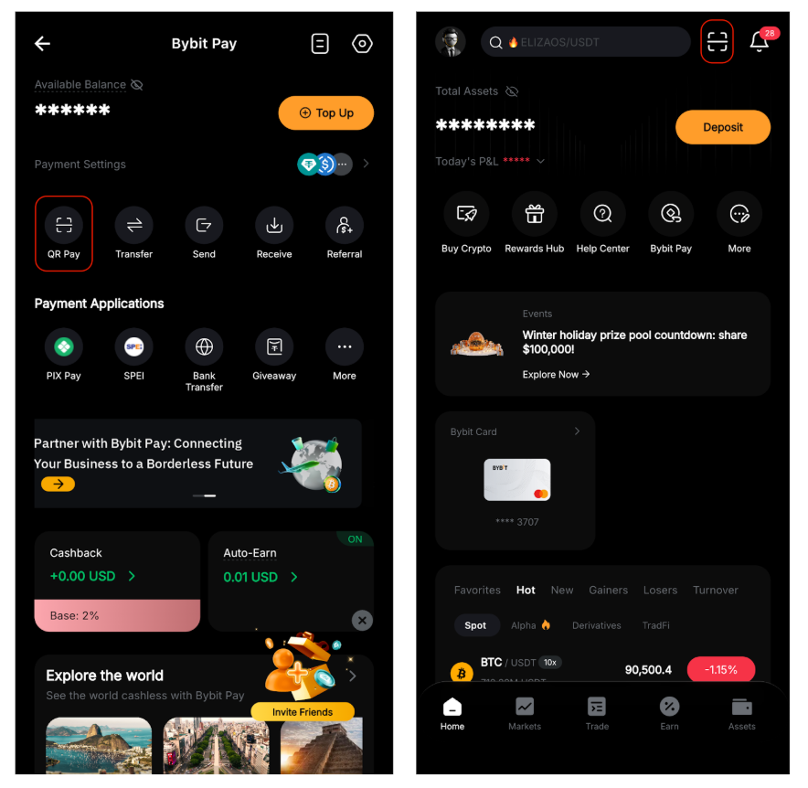 O recurso QR Pay do Bybit Pay permite que você digitalize os códigos QR do endereço da carteira compatível para concluir transferências de criptomoedas na cadeia de forma rápida e segura. Este recurso está atualmente disponível apenas no aplicativo Bybit.