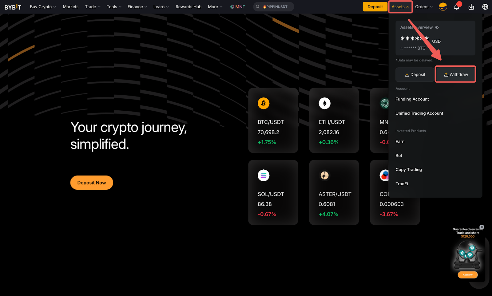 Passo 1: Passe o cursor sobre Ativos no canto superior direito da página principal da Bybit e clique em Retirar.