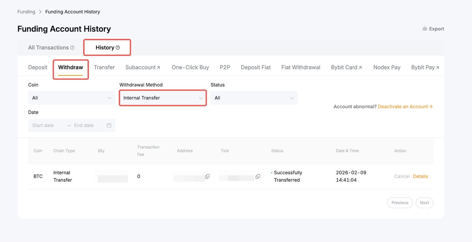 Para visualizar o seu histórico de transferências internas, por favor, vá para sua Conta de Fundos → Histórico, e selecione Transferência Interna na coluna Método de Retirada. Se você for o destinatário, selecione Transferência Interna na coluna Depósito → Método de Depósito.