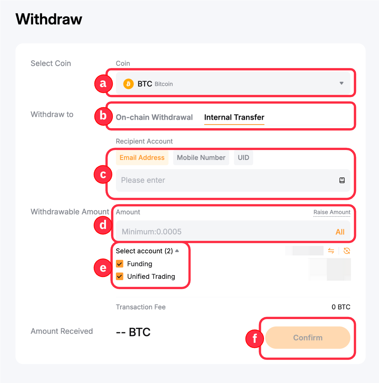e. Selecionar Conta: Marque as caixas disponíveis para escolher de qual conta você gostaria de fazer uma retirada. Você pode optar por retirar da sua Conta de Fundos, Conta de Trading Unificado, ou de ambas.