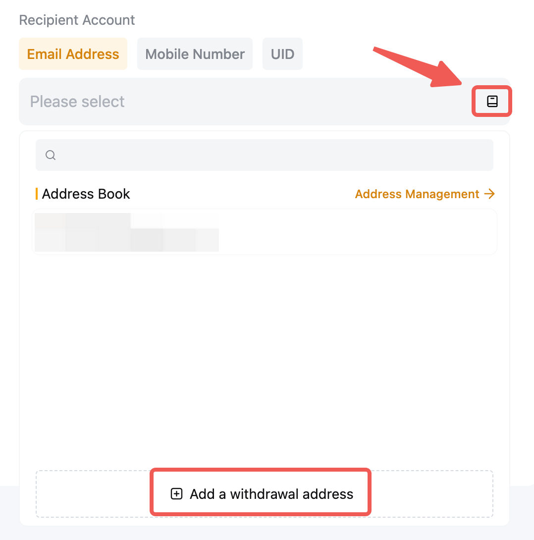 — Você pode adicionar um endereço de email, UID ou número de celular ao seu livro de endereços da carteira clicando em em Adicionar. Para mais detalhes, consulte Como Adicionar um Endereço de Carteira para Retirada.