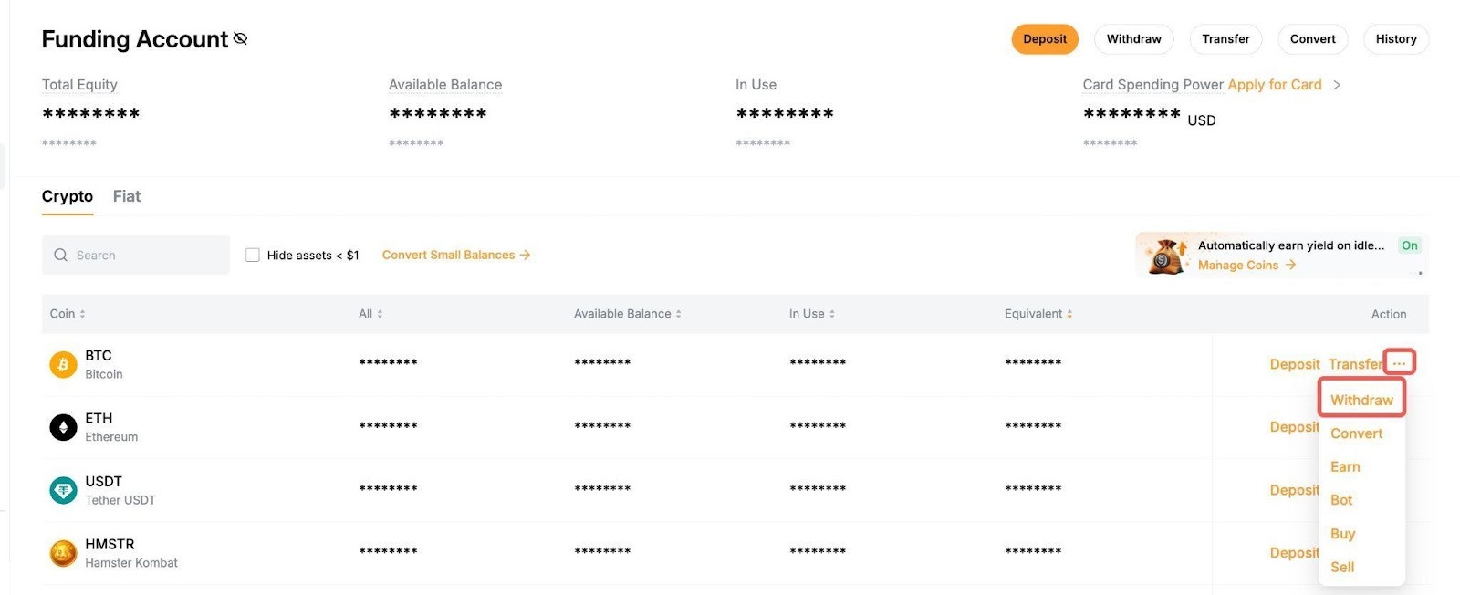 - O botão de Retirada para cada moeda só pode ser acessado através da sua Conta de Fundos.