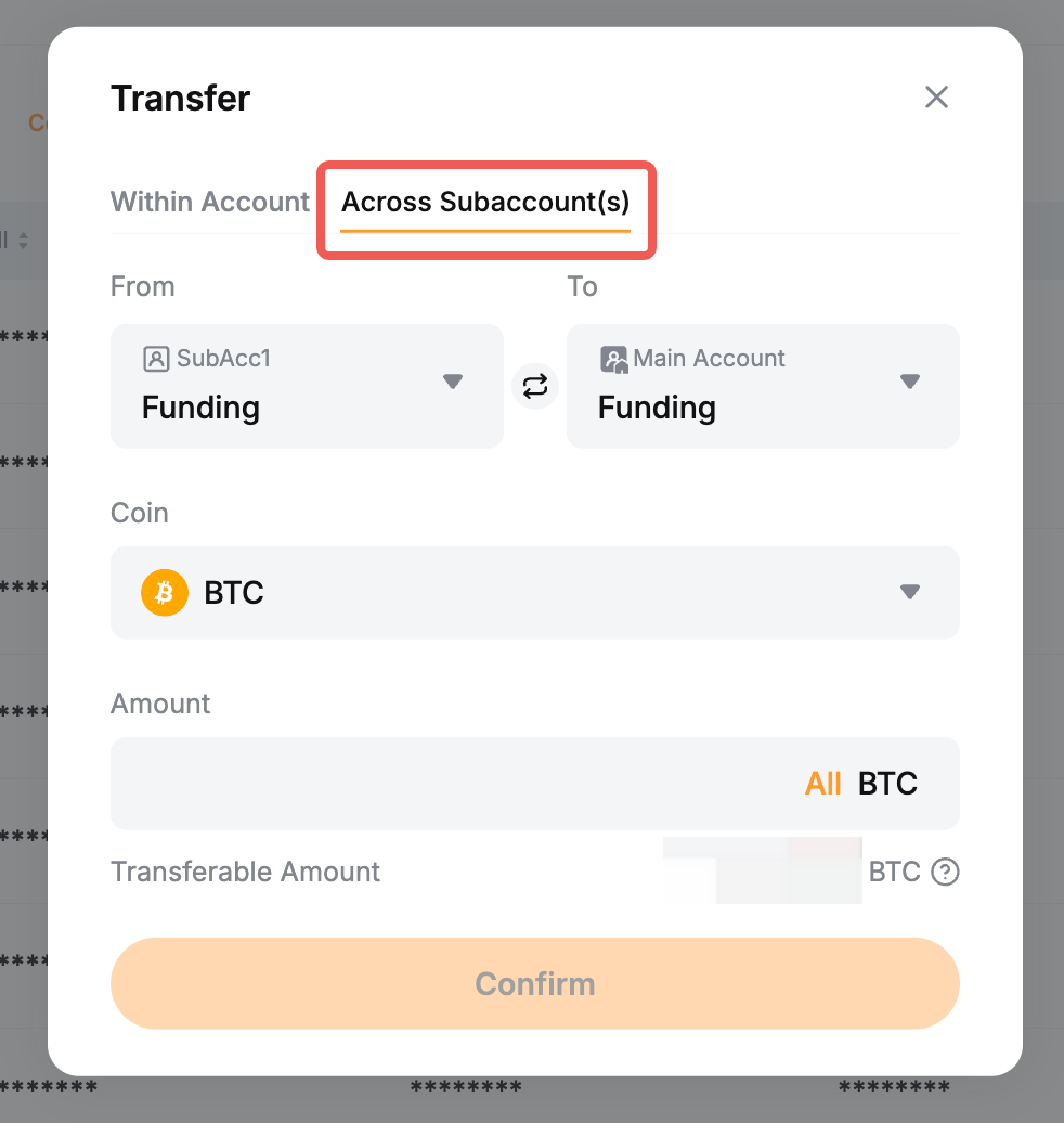 - Se você deseja retirar ativos localizados em suas subcontas, por favor transfira-os para sua conta principal clicando em Transferir e selecione a aba Entre Subcontas.