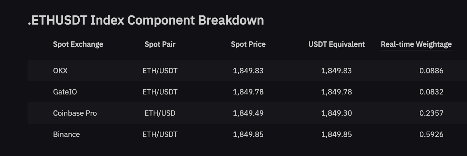 O preço do índice depende de três (3) variáveis: Preço Spot, equivalente pareado ao USDT e peso em tempo real.