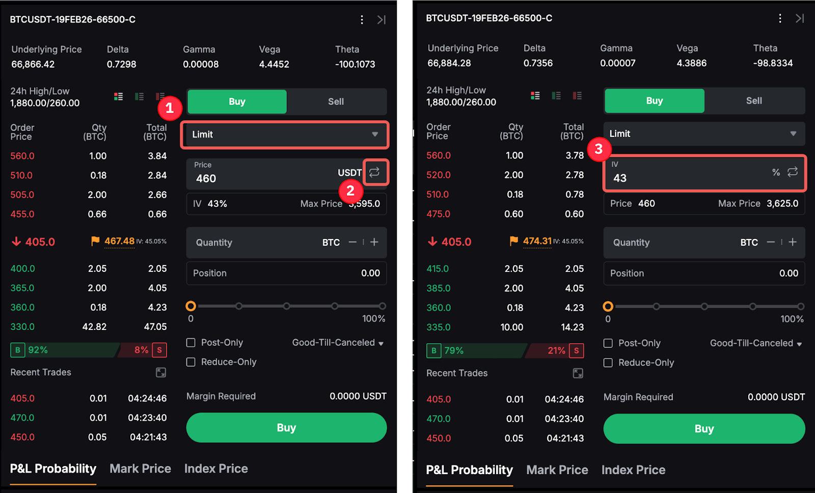 Para fazer seu pedido diretamente de acordo com o IV, você precisa alternar a porcentagem de IV sob Limite na página de pedidos de Opções. Para mais informações, consulte Como Começar a Negociar Opções na Bybit.