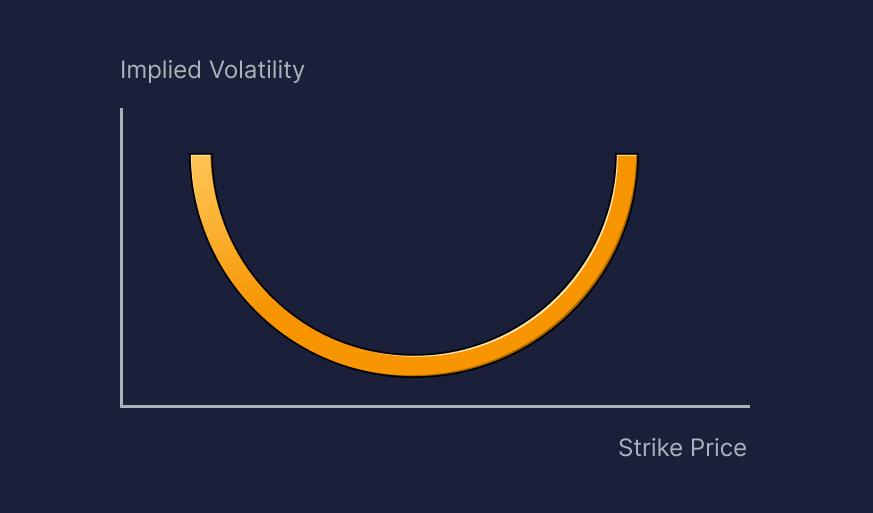Nós juntamos os valores de volatilidades implícitas de diferentes preços de exercício para formar uma curva. Uma curva simétrica dos lados esquerdo e direito é chamada de smile de volatilidade. Já uma curva assimétrica é chamada de smirk de volatilidade. A assimetria se refere à inclinação desses valores de volatilidades implícitas.