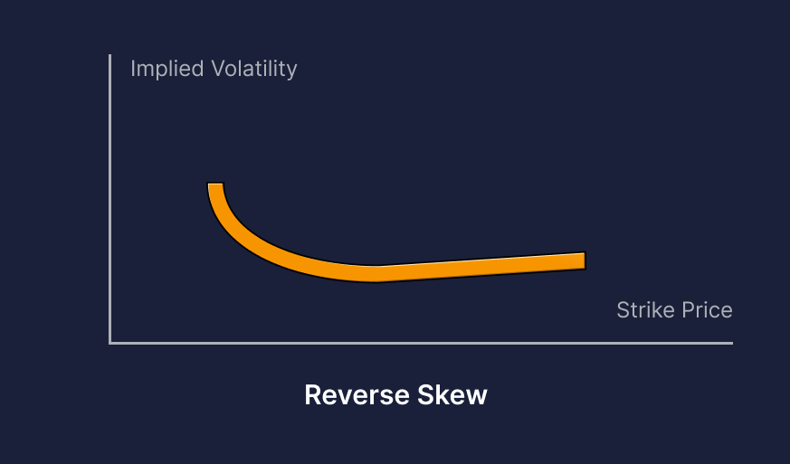 Skew reverso: os skews reversos ocorrem quando a volatilidade implícita (VI) é mais alta em preços de exercício de opções mais baixas.
