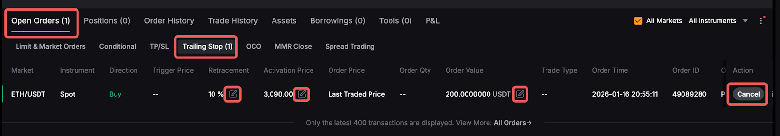 5. Se tiveres definido um preço de ativação, a ordem Trailing Stop será ativada apenas depois de o preço de ativação ser atingido. Se não for definido nenhum preço de ativação, a ordem Trailing Stop será ativada imediatamente com base no LTP atual após a colocação da ordem.