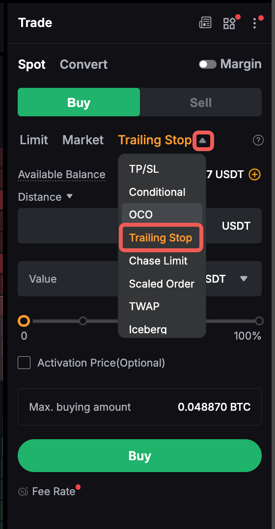 Passo 1: Vá à página de transação Spot selecione Trailing Stop Order.