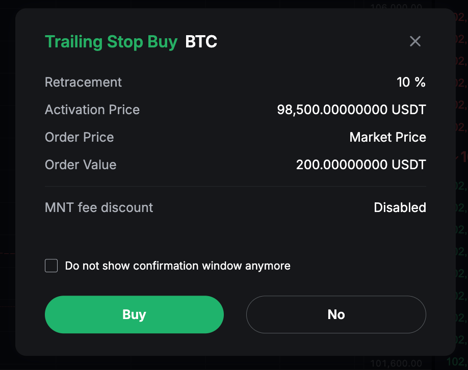 Ordem de Trailing Stop (trading em Spot e Margem Spot)