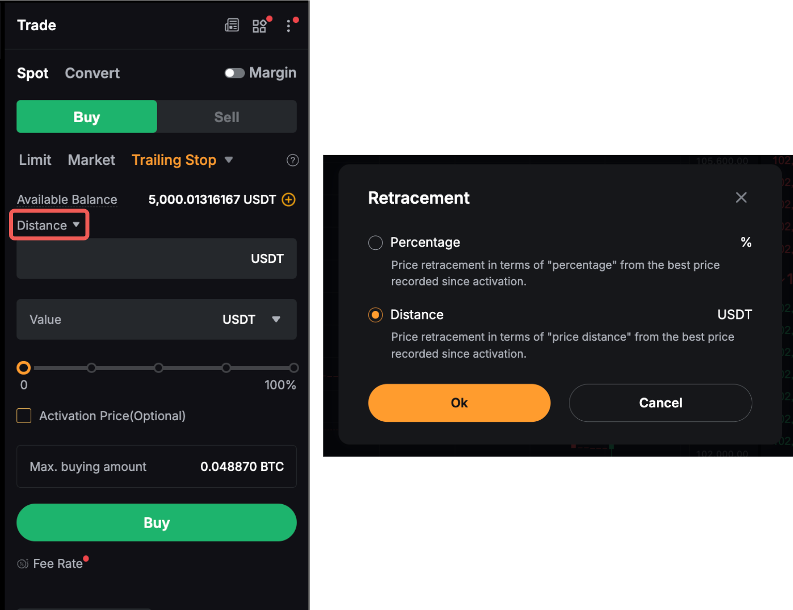 Trailing Stop na transação em Spot e de Margem é um tipo de ordem dinâmica que funciona como uma funcionalidade melhorada para Compra e Venda. Opera como uma ordem de parada que rastreia o preço de mercado de um ativo ou posição e ajusta automaticamente a ordem de parada para minimizar a perda ou bloquear os lucros à medida que o preço se move em favor do operador. Uma vez determinado o Trailing Stop, se o preço de mercado atingir um determinado nível e, em seguida, recuar por um montante predeterminado definido pelo utilizador, será desencadeada uma ordem de mercado.