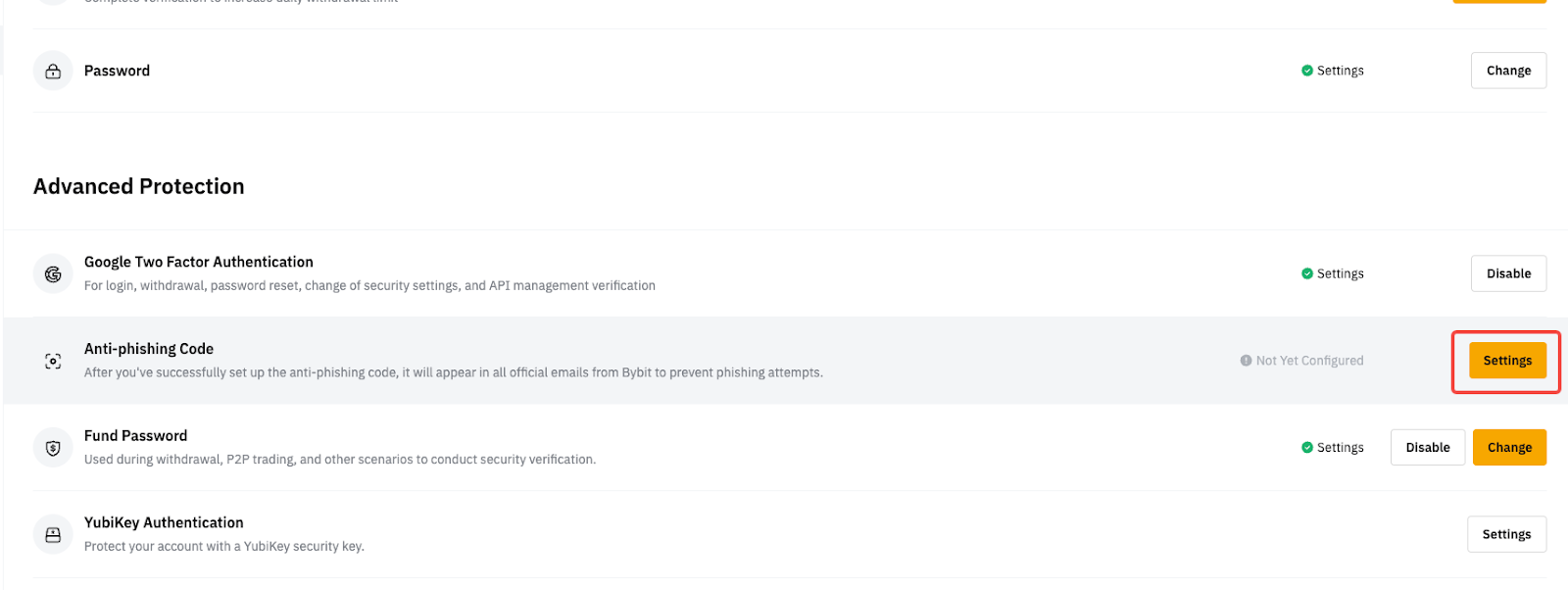 Чтобы снизить риск фишинга, Bybit настоятельно рекомендует настроить код защиты от фишинга через веб-сайт или мобильное приложение. Если вы ещё не активировали антифишинговый код, перейдите на страницу Аккаунт и безопасность и следуйте этому руководству.