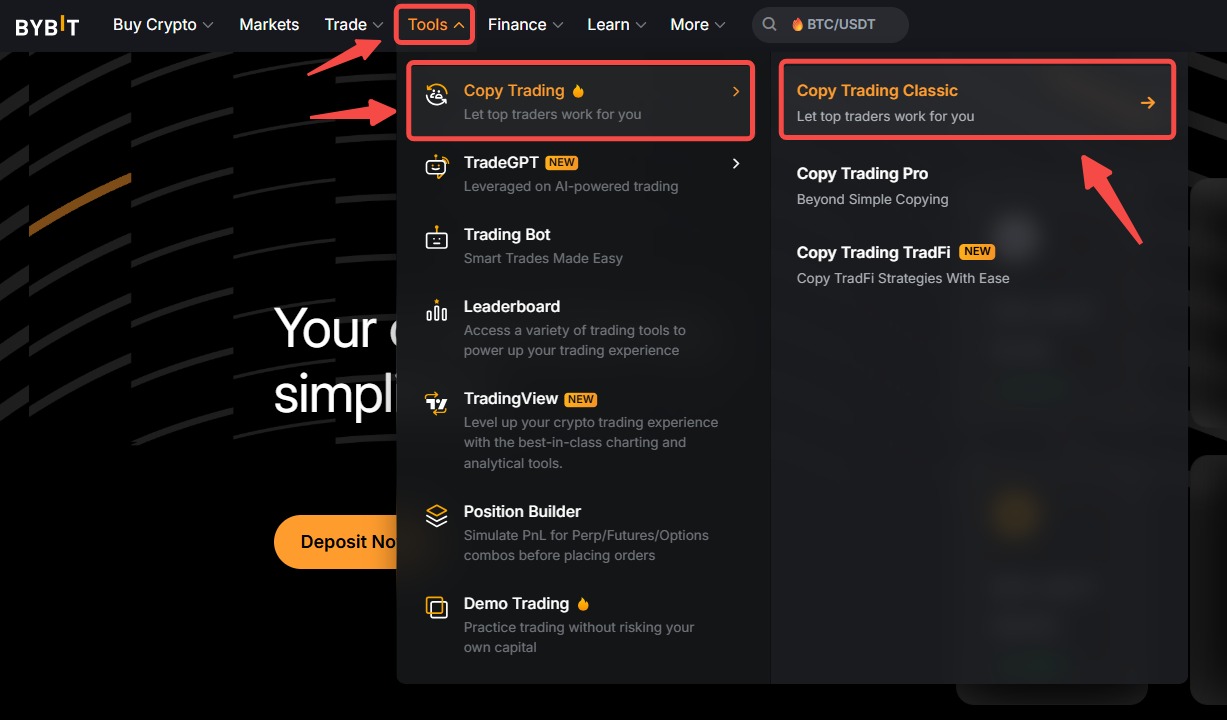 Шаг 1. Чтобы перейти на страницу копитрейдинга Classic, нажмите Инструменты → Копитрейдинг на панели навигации.