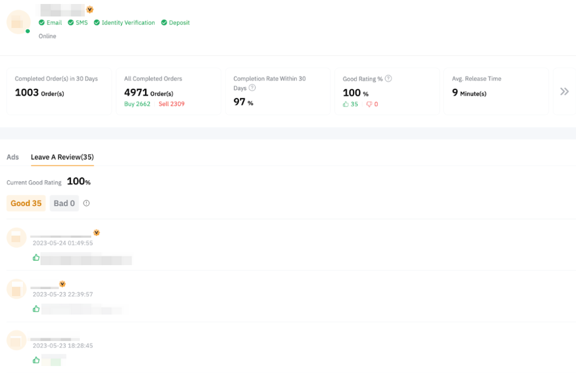 - Пользователи могут оставить отзыв только для контрагента по выполненному P2P-ордеру. В зависимости от фактического опыта торговли можно оставить только один отзыв на каждого пользователя.