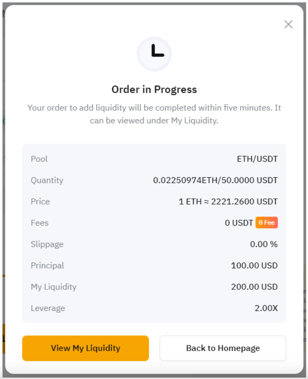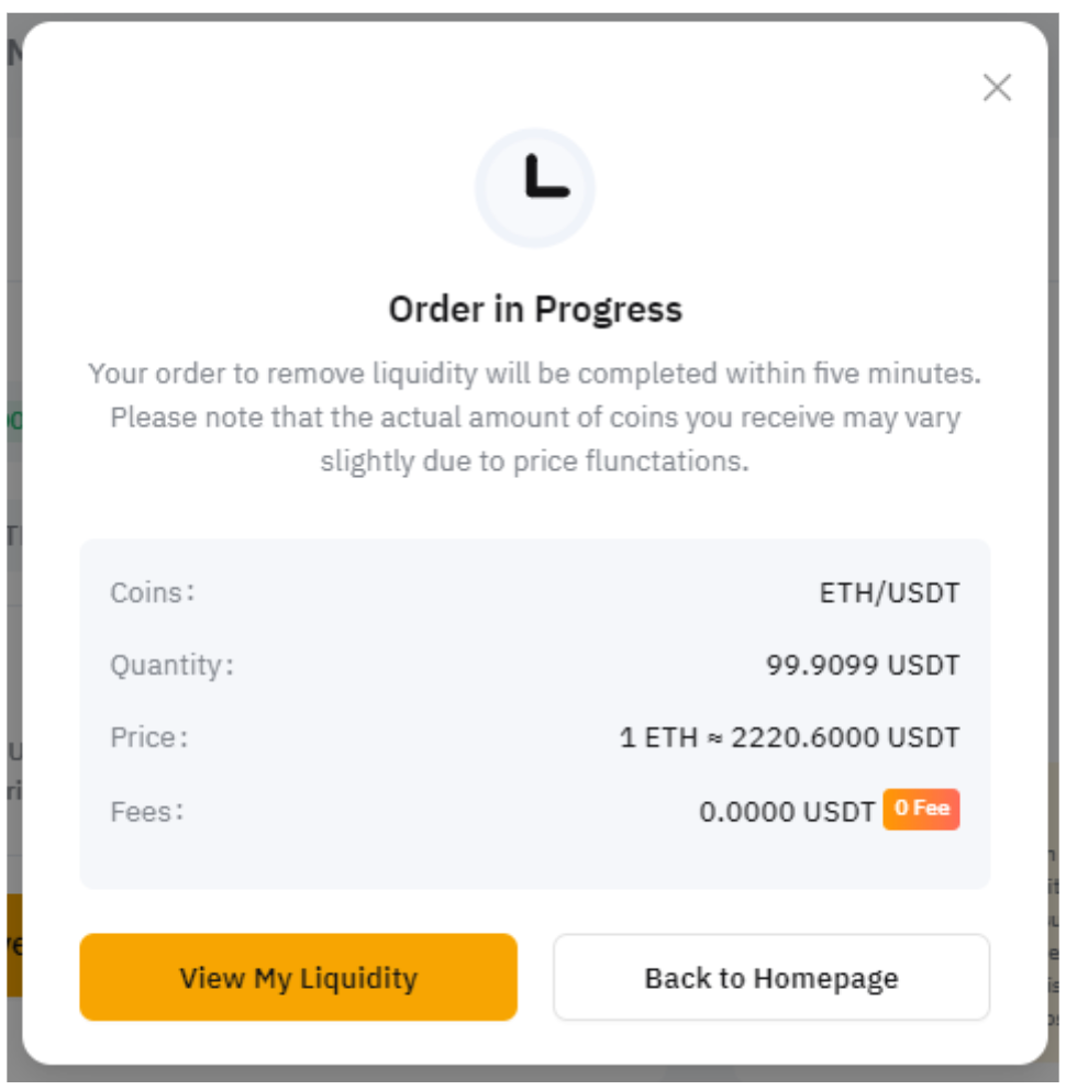 Обратите внимание, что ордер на добавление ликвидности будет выполнен в течение пяти минут. Если добавление ликвидности не завершено, ликвидность соответствующей торговой пары не может быть изъята.