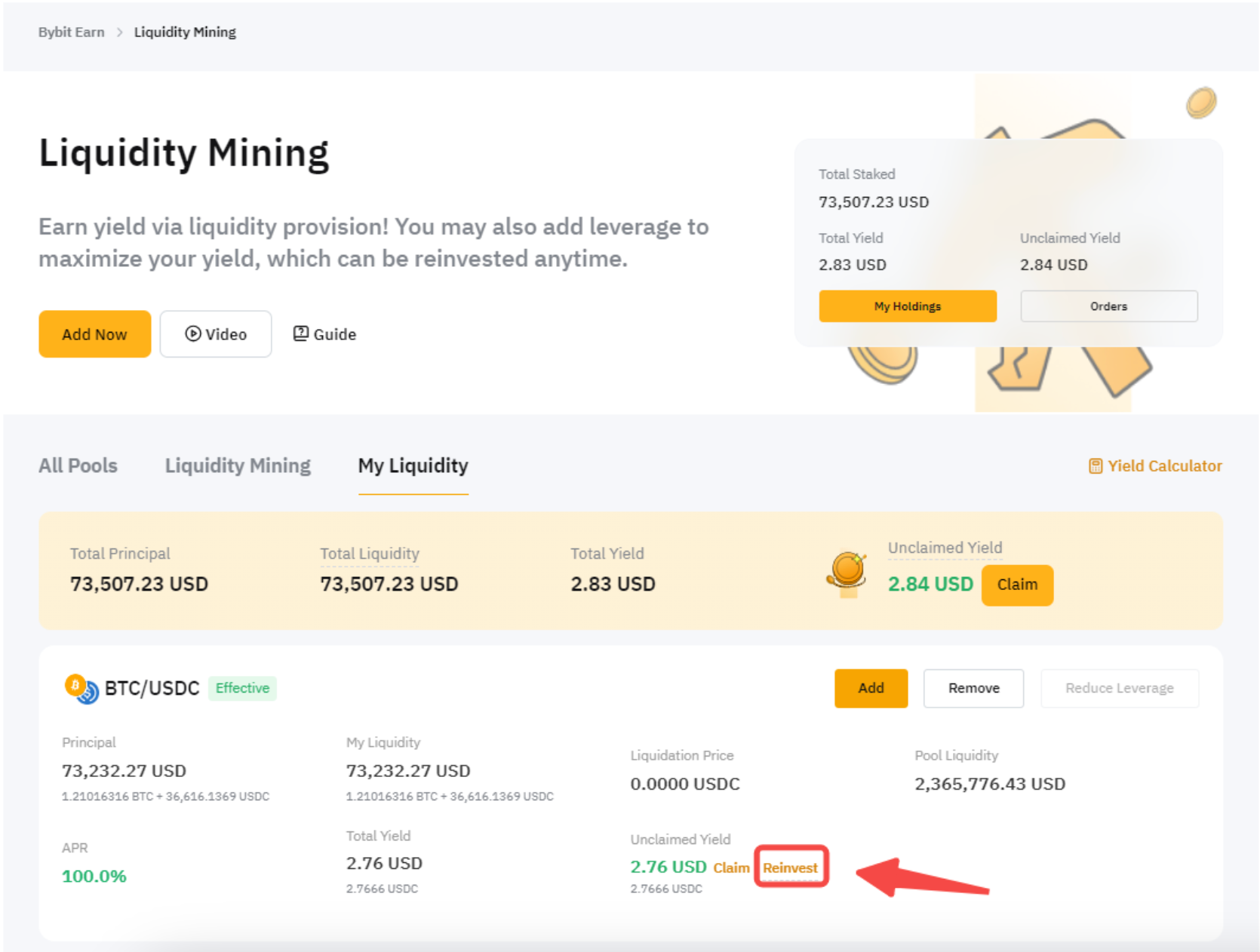 Шаг 1. Нажмите Реинвестировать под надписью Доход к получению, каждого отдельного пула ликвидности, чтобы увеличить свой доход.