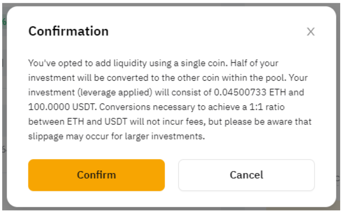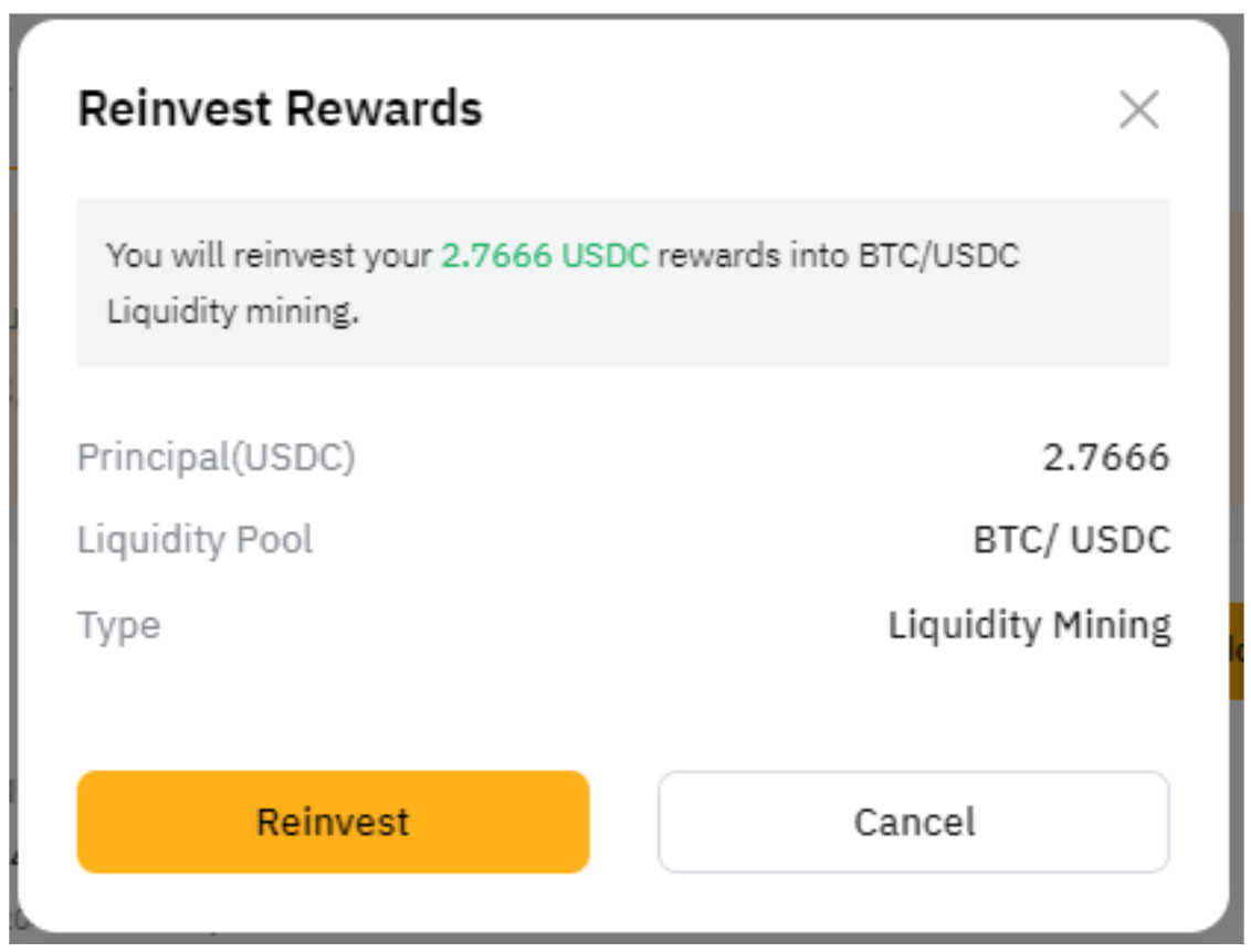 Шаг 2. Нажмите Реинвестировать в окне подтверждения реинвестирования, чтобы добавить доход в пул ликвидности.