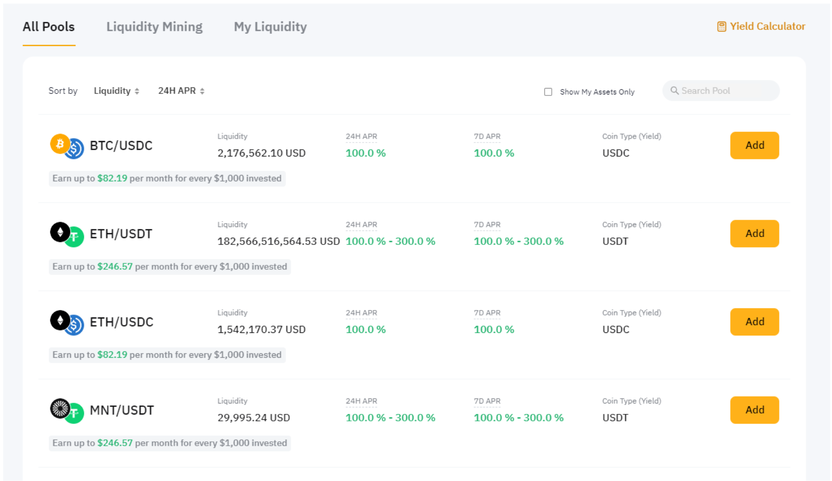 Шаг 2. Выберите пул ликвидности. Посмотрите доступные пулы в разделе Все пулы и выберите тот, в который хотите добавить ликвидность. Нажмите Добавить, чтобы перейти на страницу добавления ликвидности.