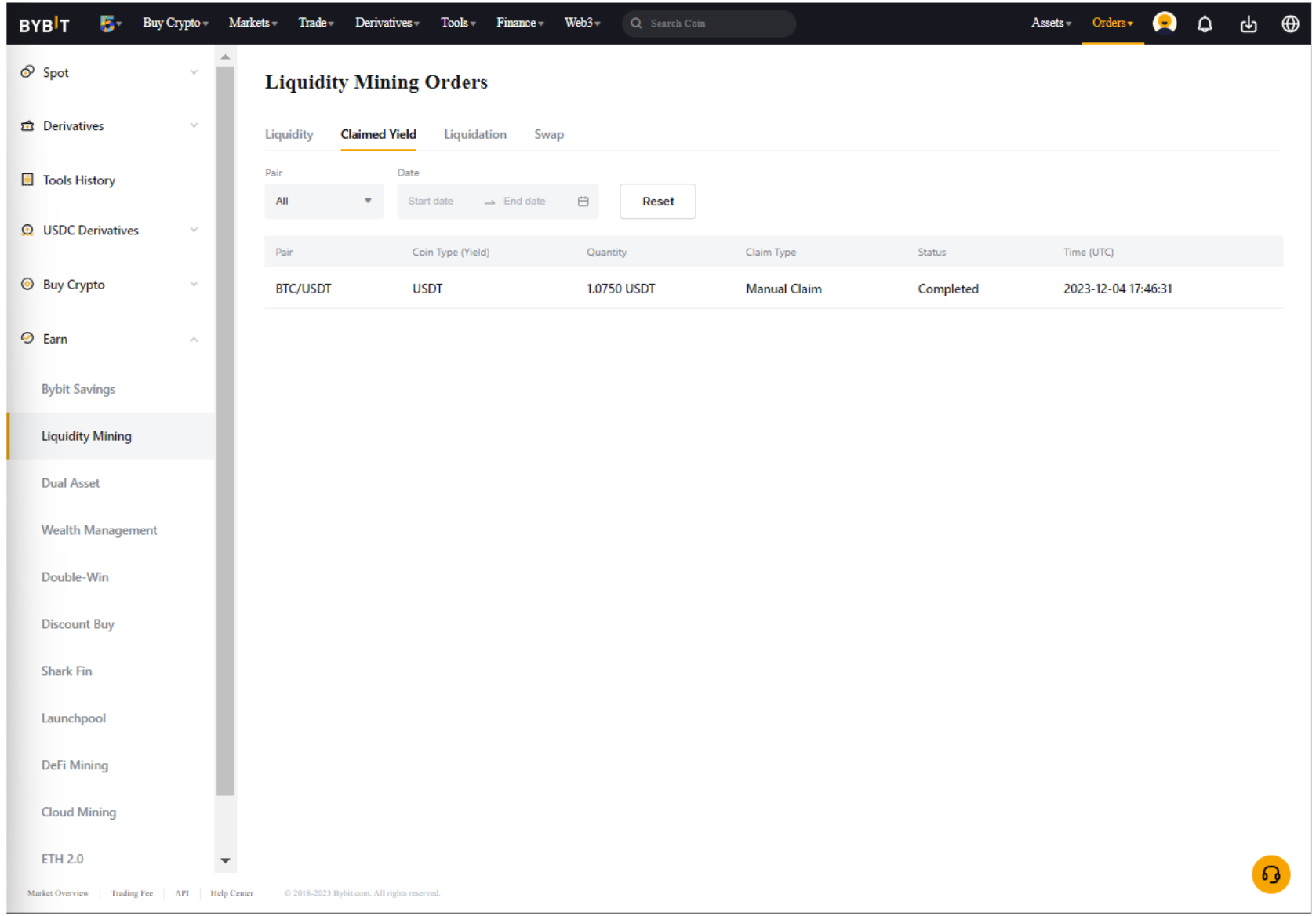 Чтобы посмотреть подробную информацию о полученном доходе, перейдите в раздел Ордера →  Earn ордер → Майнинг ликвидности → Полученный доход.