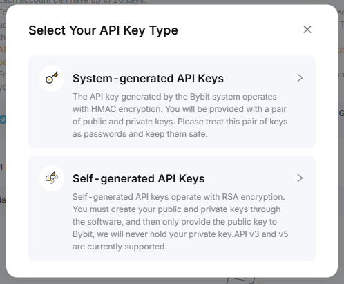 Шаг 2: Нажмите Создать новый ключ. Появится всплывающее окно, в котором можно выбрать тип API-ключа, наиболее соответствующий вашим торговым потребностям.