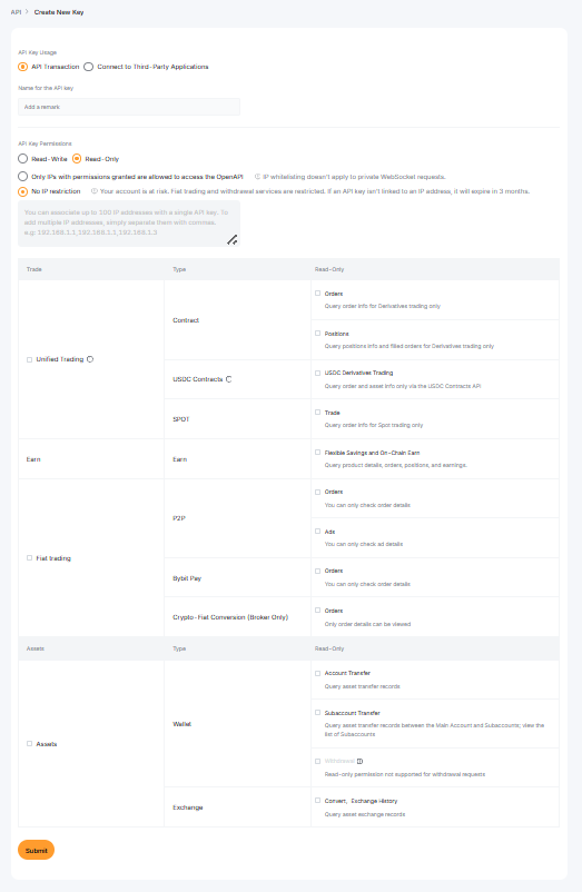 Шаг 3: Настройте свой API-ключ. Убедитесь, что для разрешений API-ключа установлено значение Только чтение. По завершении нажмите Отправить.