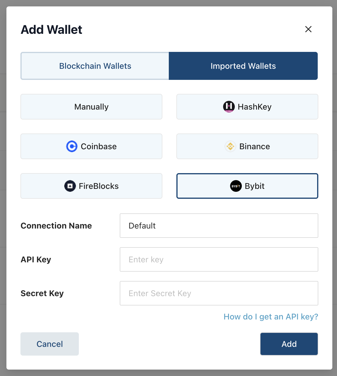 Шаг 6: Во всплывающем окне выберите Bybit и введите информацию о только что созданном API-ключе Bybit. Вам нужно будет ввести: