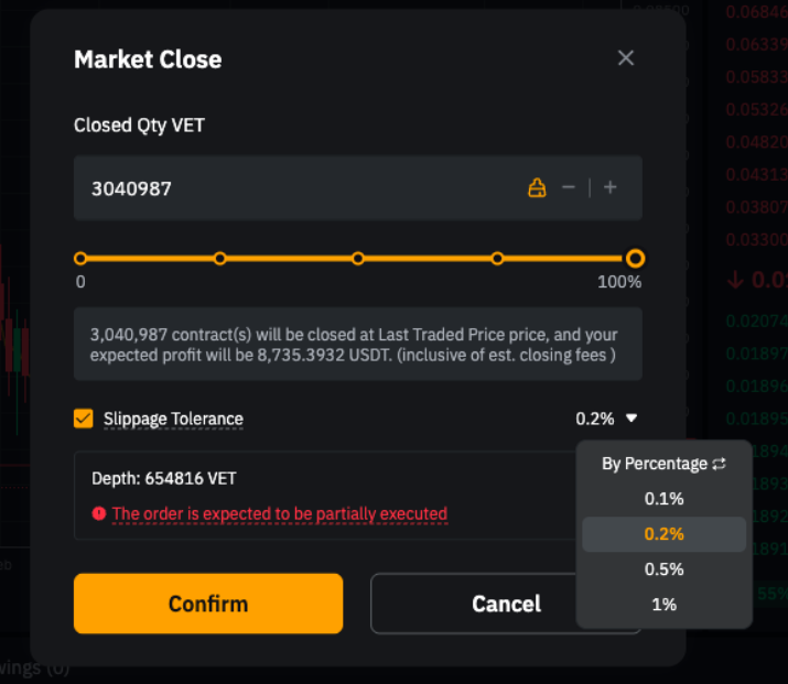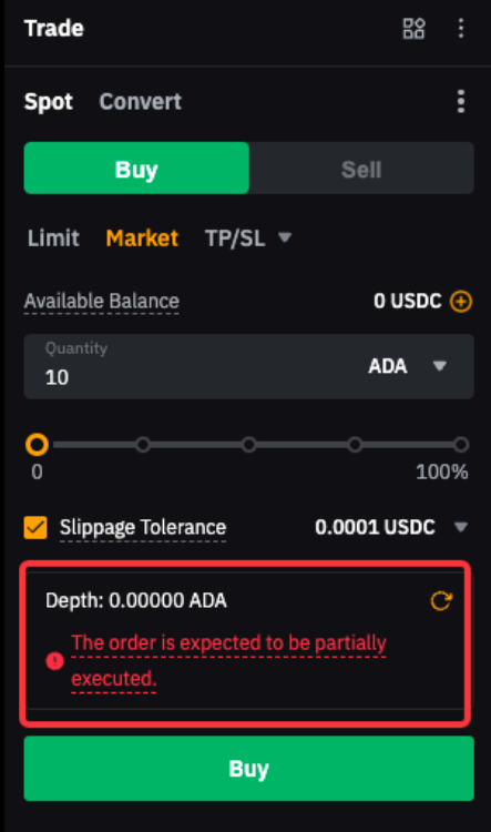 — Фактическое исполнение зависит от размера ордера и глубины рынка, поэтому нет гарантии полного исполнения. Если глубины рынка не хватает для полного исполнения ордера, будет исполнена только та часть, которая находится в пределах допустимого проскальзывания, а любая сумма, выходящая за пределы, будет отменена.