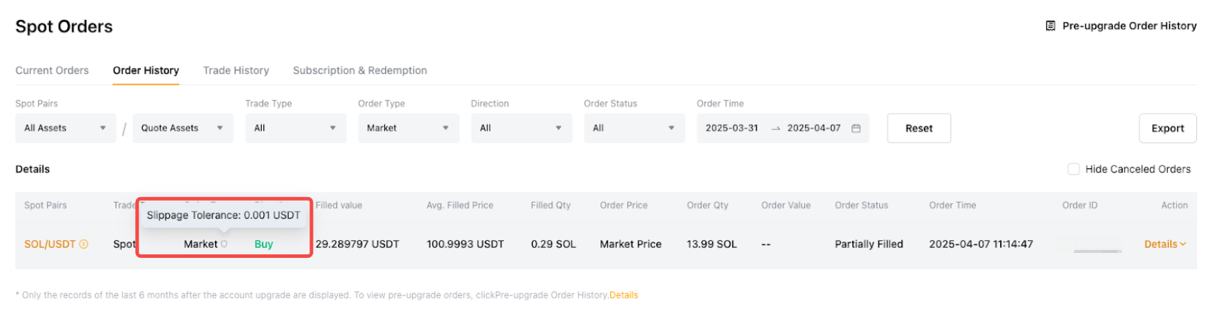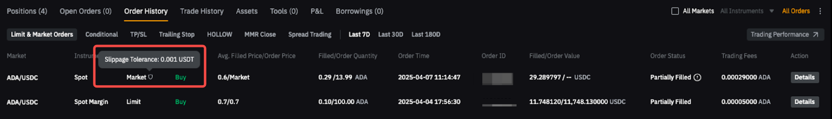 В нижней части страницы торговли найдите раздел История ордеров. Наведите курсор на ордер, чтобы посмотреть допустимое проскальзывание.