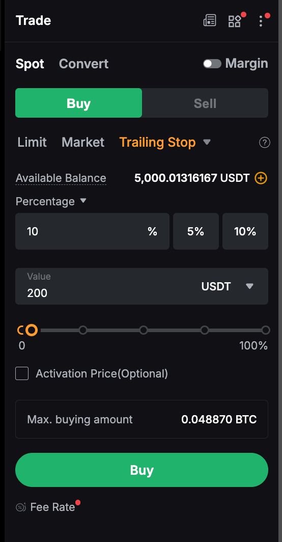 Трейдинг-стоп в спотовой торговле и торговле маржей — это динамический тип заказа, который функционирует как расширенная функция для покупки и продажи. Он действует как стоп-приказ, который отслеживает рыночную цену актива или позиции и автоматически корректирует стоп-приказ, чтобы свести к минимуму потерю или блокировку прибыли по мере изменения цены в пользу трейдера. Как только будет определена остановка, если рыночная цена достигнет определенного уровня, а затем будет отслежена на заранее определенную сумму, установленную пользователем, будет инициировано рыночное распоряжение.