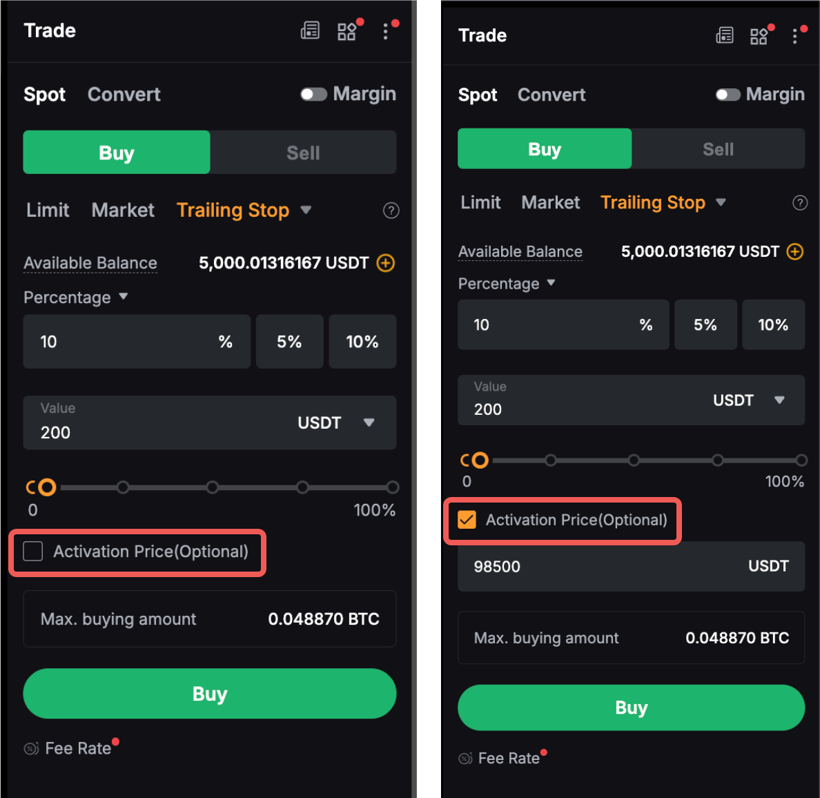 - Если последняя торгуемая цена упадет до 3700 USDT, то Trailing Stop останется на уровне 3690 USDT.