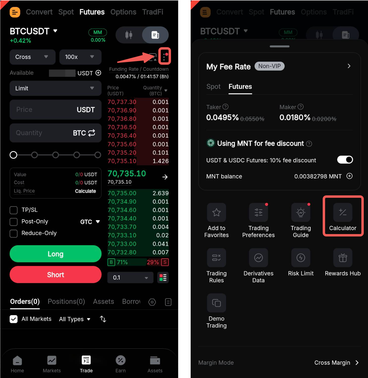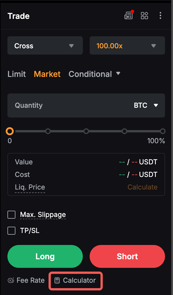 Крок 1: У вебверсії калькулятор Bybit можна знайти в нижньому лівому куті зони ордера. Якщо ви користуєтеся застосунком, перейдіть у розділ «Торгівля» й торкніться значка трикрапки у верхньому правому куті, щоб відкрити сторінку налаштувань торгівлі.