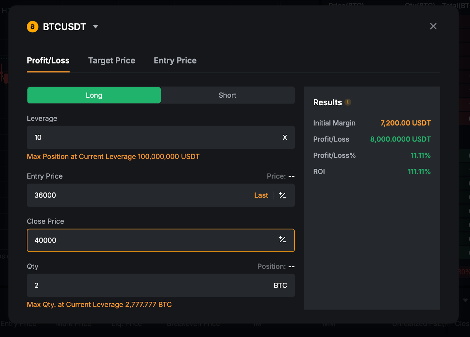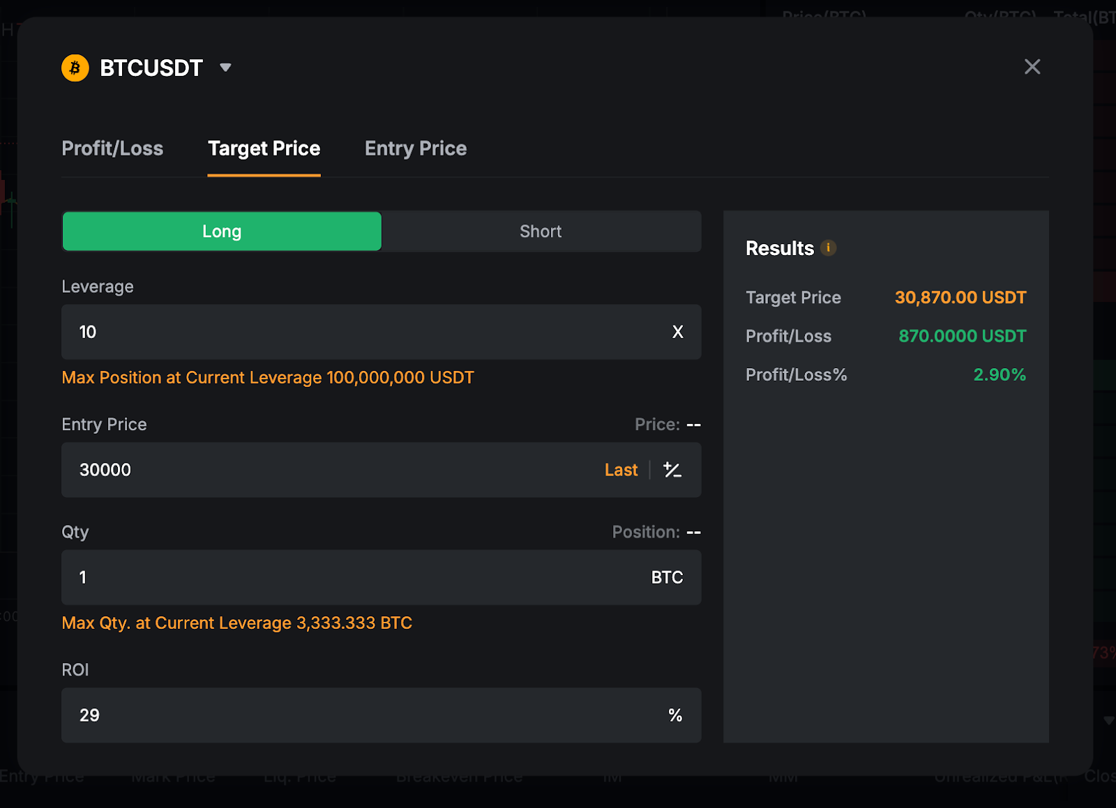 Увівши наведені вище значення, ми зможемо розрахувати, що для виходу позиції на рівень 29% ROI, цільовий тейк-профіт / ціну виходу потрібно встановити на рівні приблизно 7280 USDT.