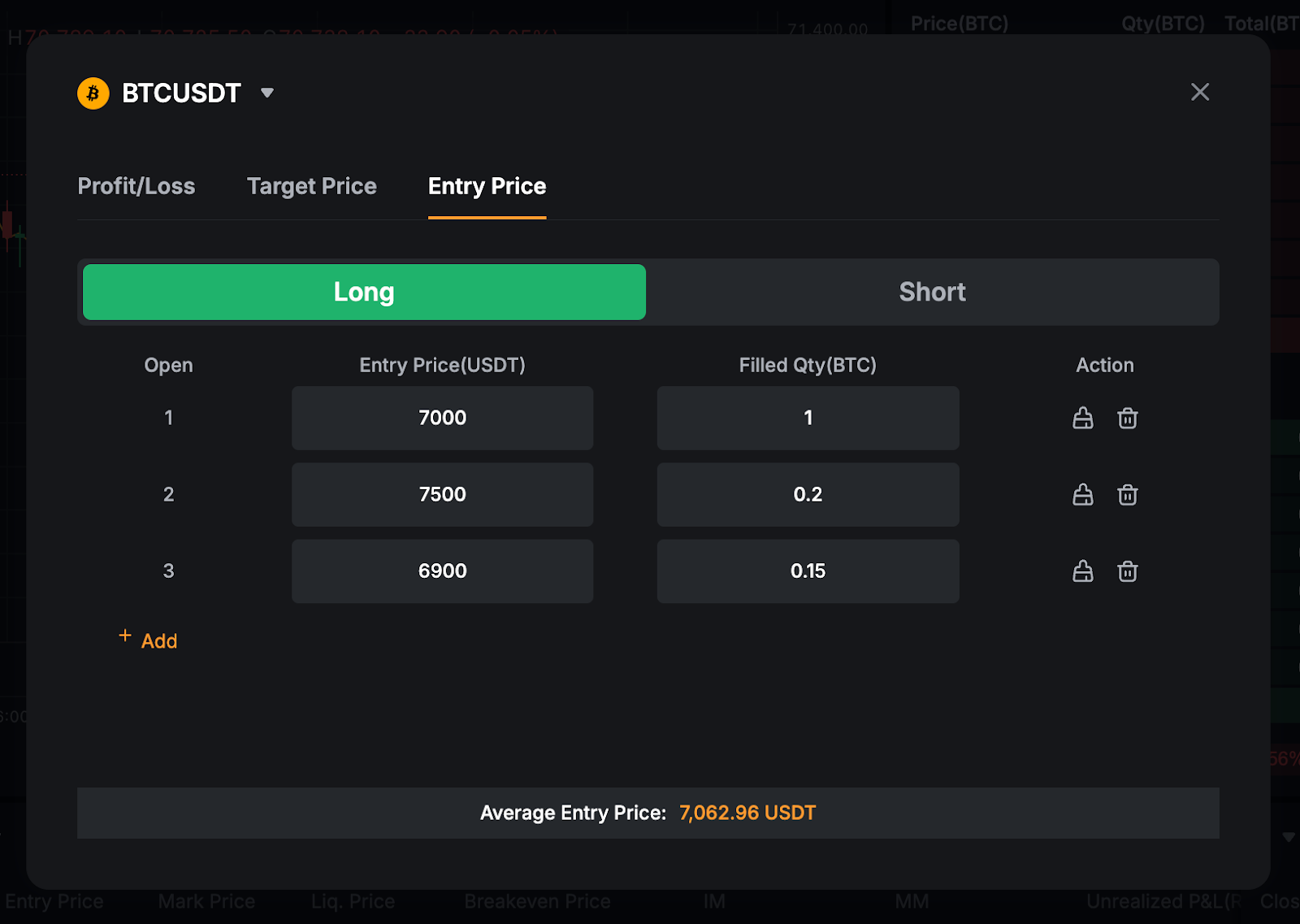 Після введення набору значень у калькуляторі середня ціна входу відображатиметься на рівні 7062,90 USDT.