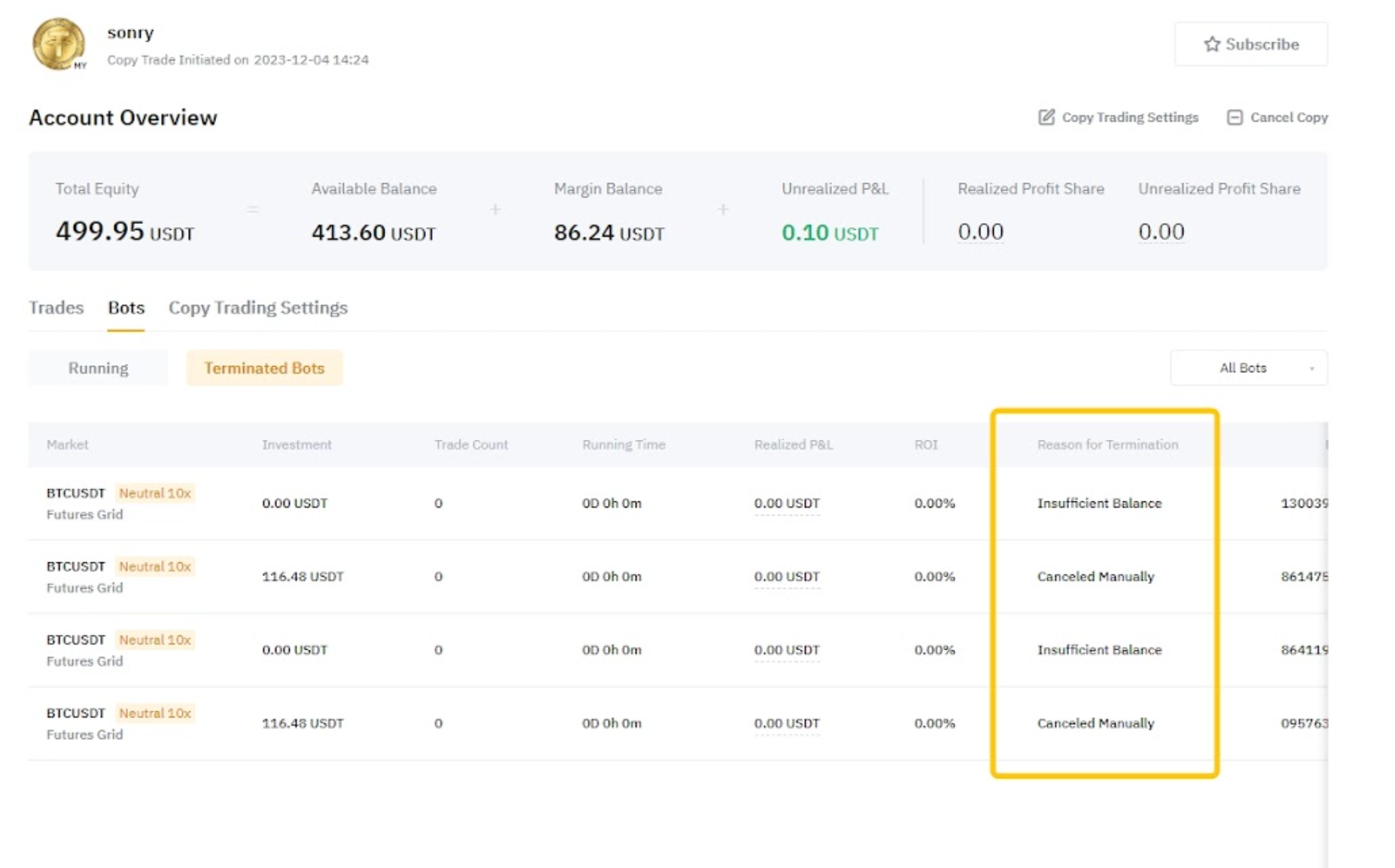 Це пояснюється тим, що скопійовані торгові боти пов’язані з Copy Trading і доступ до них можливий лише через Центр користувача (Підписник). З іншого боку, власноруч створені торгові боти будуть виставлені під головним входом торгового бота. Для отримання додаткової інформації зверніться до розділу Як розпочати копітрейдинг (Підписник).